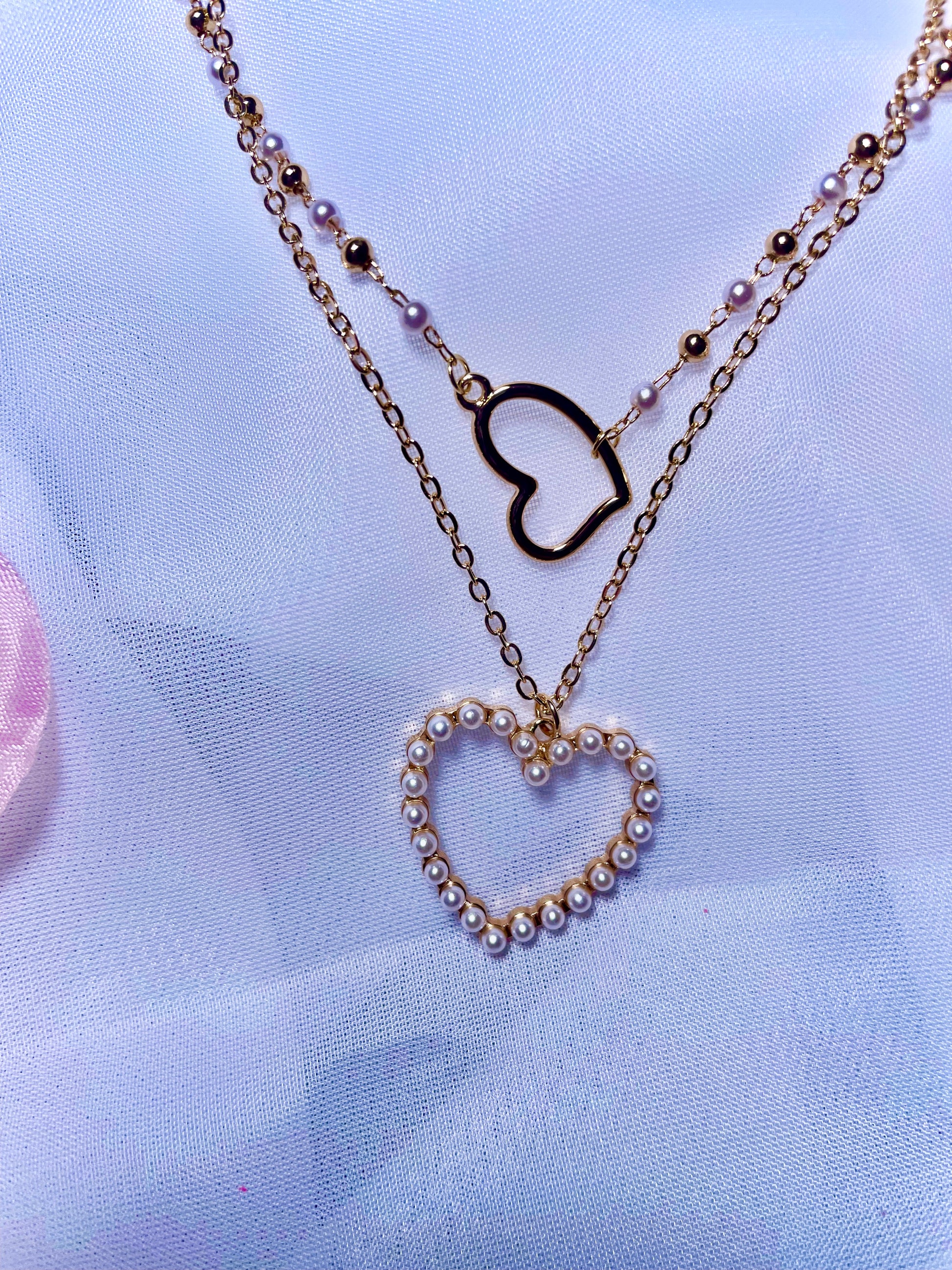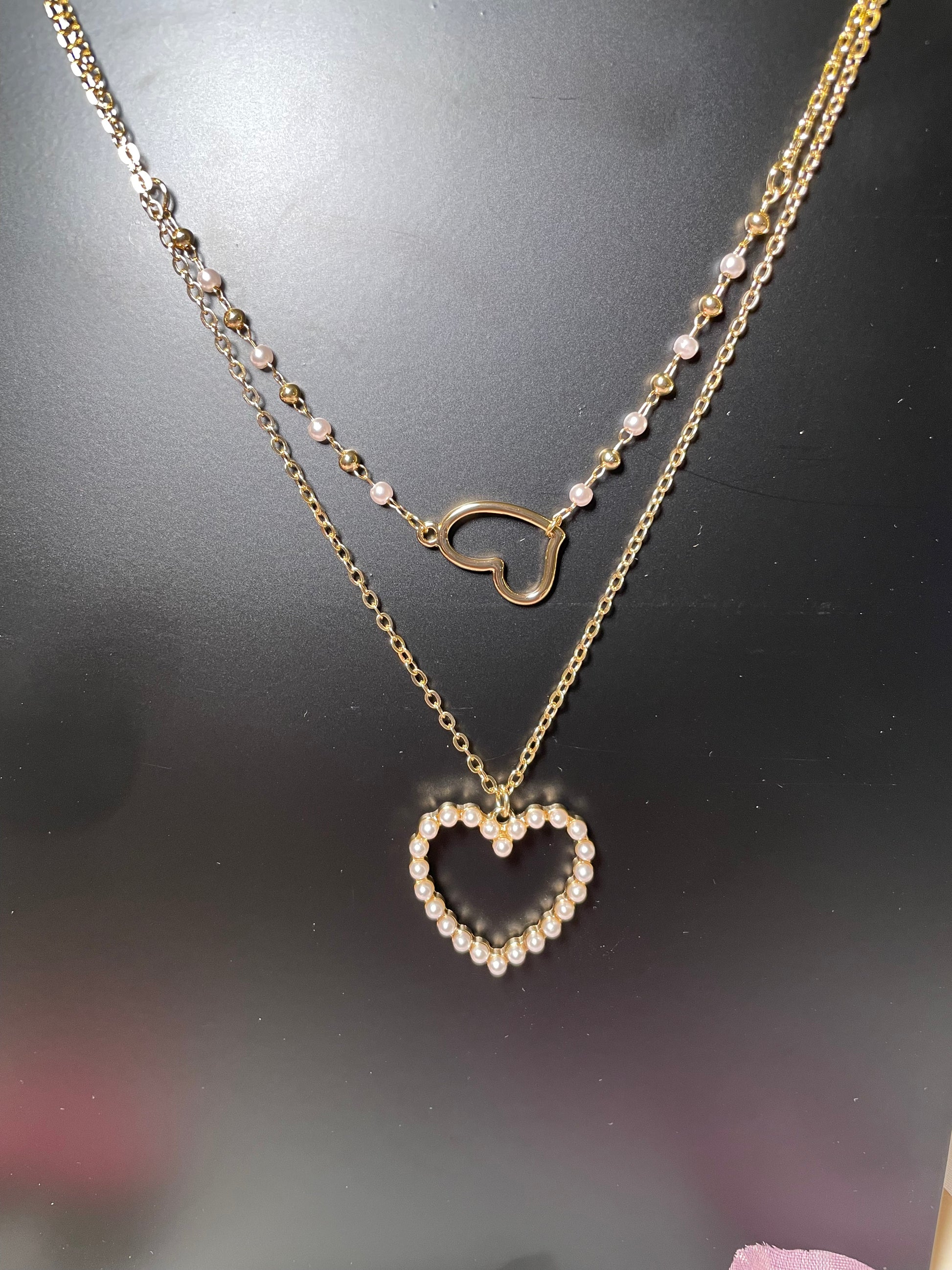 Add a touch of romance with Belle layered necklace. This stylish piece features elegant pearl studs and a charming double heart design. Perfect for any occasion, it's a must-have for any fashion-forward individual. Don't miss out on this lovely accessory!